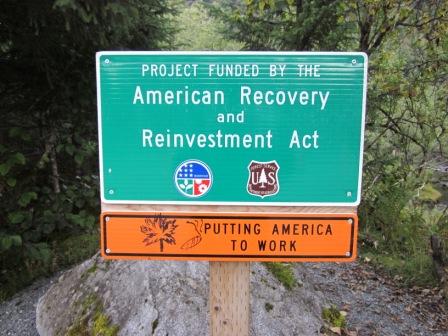 Here is the beginning of a beautifully built and maintained trail at the Mendenhall Glacier outside Juneau. You can see that construction of the trail, which must have employed several people to cut brush and grade the path, was paid for by the federal stimulus package. As for the big Bob Marley joint depicted on the sign….it’s unclear if federal dollars paid for that.